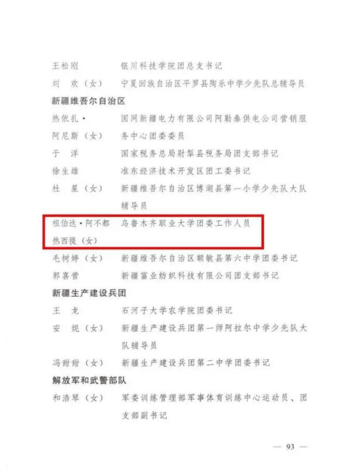 祖伯达·阿不都热西提,女,维吾尔族,中共党员,现任乌鲁木齐职业大学团委干部。先后荣获自治区优秀共青团干部、乌鲁木齐市优秀共青团干部等称号。工作以来,她把铸牢中华民族共同体意识贯穿始终,切实做好青年思想引领,充分展现了新时代团干部的使命担当。