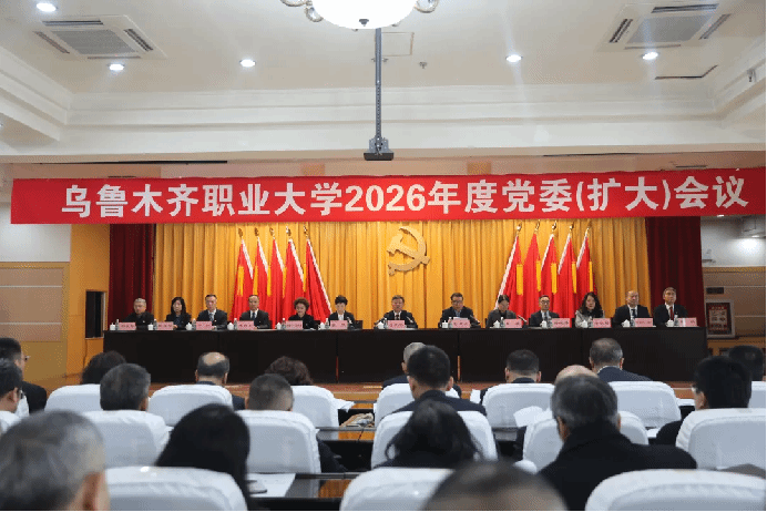 3月18日下午,乌鲁木齐职业大学在校本部学术交流中心召开2026年度党委(扩大)会议。会议坚持以习近平新时代中国特色社会主义思想为指导,全面贯彻党的二十大及二十届历次全会精神,深入落实习近平总书记关于新疆工作的重要讲话重要指示批示精神,特别是出席自治区成立70周年庆祝活动期间的重要指示精神。会议完整准确全面贯彻新时代党的治疆方略,紧扣铸牢中华民族共同体意识主线,锚定党中央赋予新疆的“五大战略定位”,系统总结2025年工作,科学研判发展形势,全面部署2026年重点任务,动员全校上下凝心聚力,努力实现“十五五”良好开局。